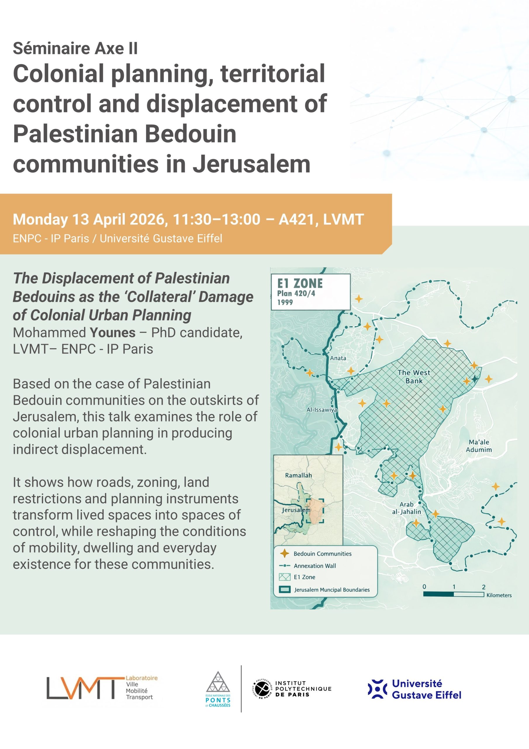 Sa présentation, intitulée “Colonial planning, territorial control and displacement of Palestinian Bedouin communities in Jerusalem”, a proposé une analyse du rôle de l’urbanisme colonial et des instruments de planification (zonage, infrastructures, restrictions foncières) dans la production de déplacements indirects de communautés bédouines palestiniennes en périphérie de Jérusalem. La séance a donné lieu à des échanges riches sur les dimensions socio-spatiales, juridiques et environnementales de ces transformations.