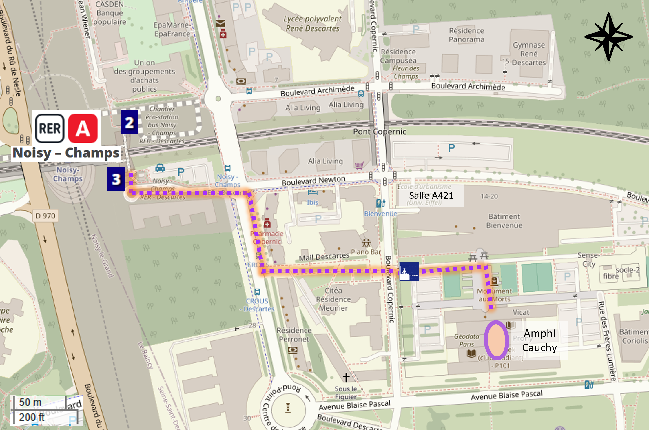 Prendre la sortie 3 (Boulevard Newton Cité Descartes). Suivre le cheminement du plan pour accéder à l’enclos par le poste de sécurité (au 12 Bd Copernic 77420 Champs-sur-Marne). Le bâtiment Carnot se situe sur la droite. L’amphithéâtre Cauchy est au niveau -1, accessible par l’escalier central au milieu du hall ou par le deuxième ascenseur, à droite.
